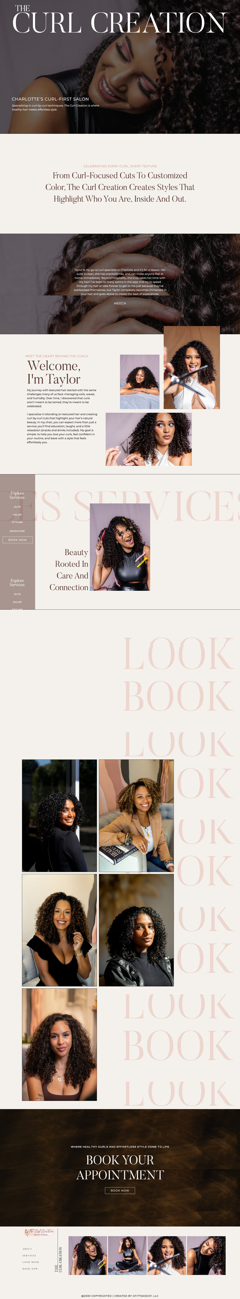 This project was truly a partnership made in heaven. What started as a casual conversation during my hair appointment with Taylor quickly turned into a creative collaboration. Between chats about business, life, and everything in between, we realized her brand was ready for an online home. Taylor didn’t have a website yet, just a simple booking page and a DIY brand kit with a logo and a few colors. Together, we set out to build a single-page site that would give her a professional presence, connect her services, and capture her effortless, down-to-earth vibe.